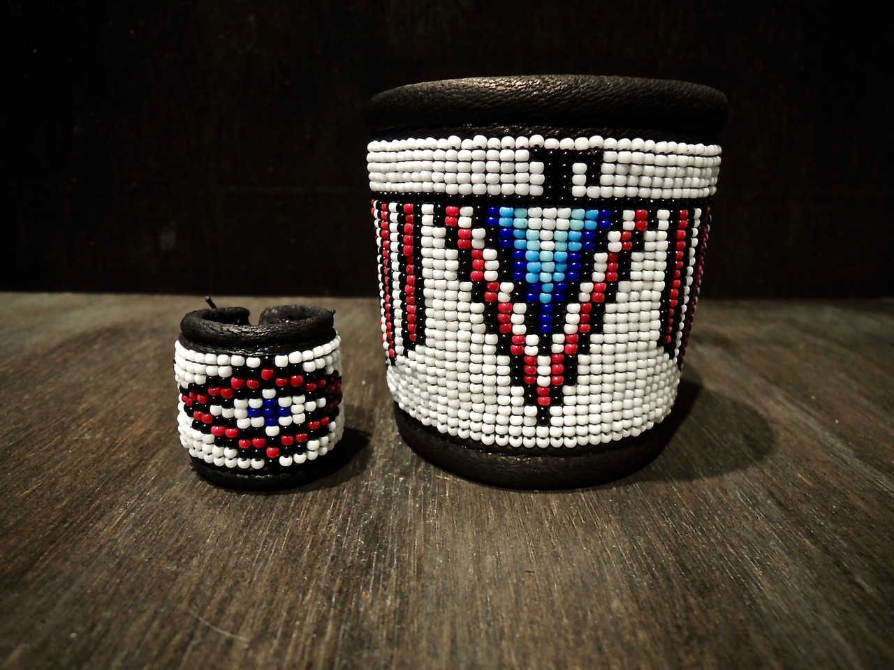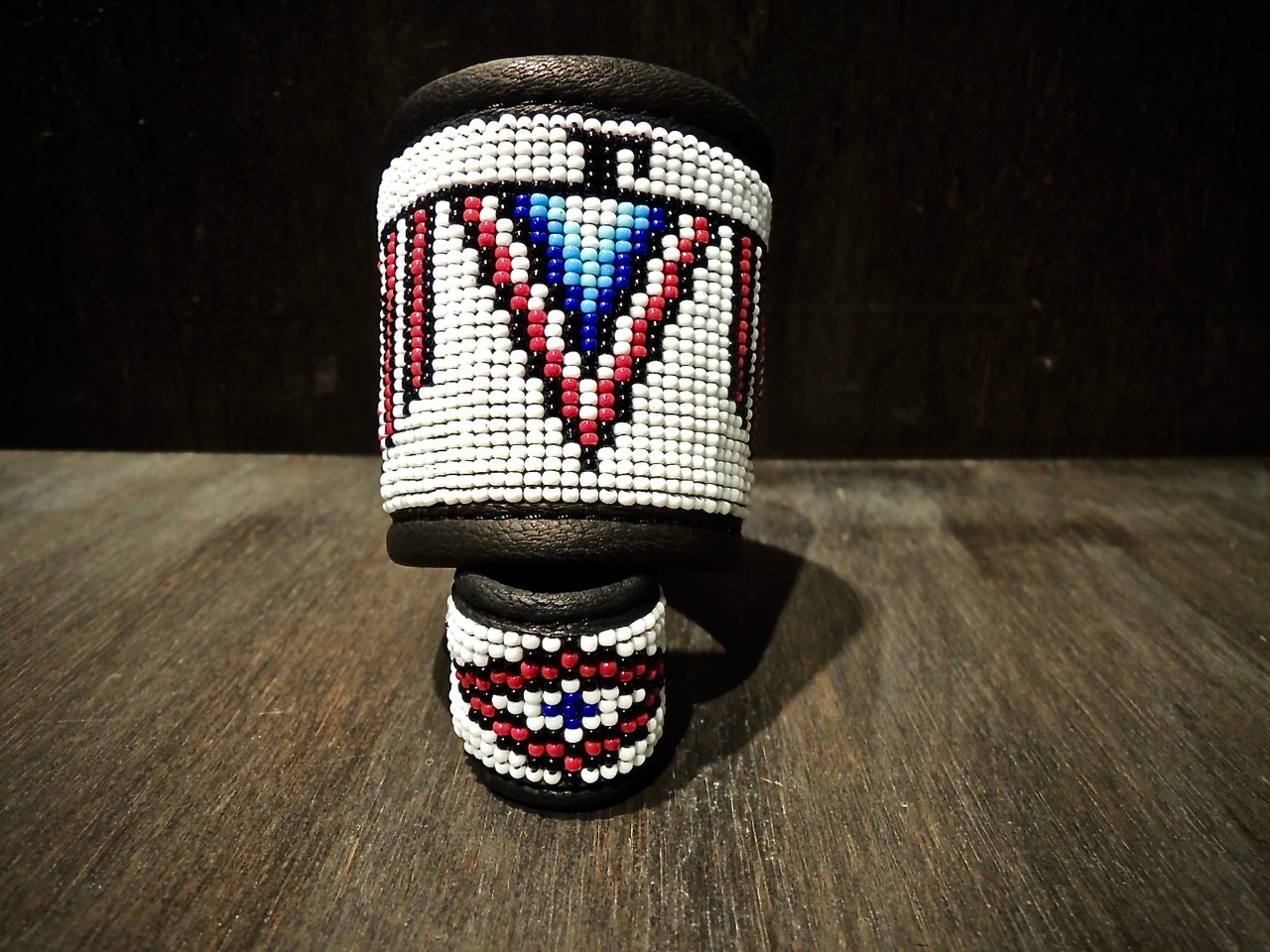 ネイティブアメリカンのシンボルであるサンダーバードを用いたブレスレット。インディアンが衣服などの装飾でガラス製ビーズを使い始めたのは19世紀初頭。さまざまな大きさのビーズがありますが、直径1~4ミリ程の「シードビーズ」というものを、ブレスレットの装飾として使用しています。ビーズ装飾の周りをスタッズ加工する事により、繊細なビーズを傷つけないように機能面にも優れています。革は全て鹿革(ディアスキン)を使用しています。ビーズ刺繍を施す際に、しなやかさがある鹿革はとても適した革であり、人間の皮膚に近いとされていることから、着用した際の付け心地が肌の一部と錯覚してしますような感覚が魅力的です。他にはないオリジナルのインディアンアクセサリーは、一点一点ハンドメイドで作っているため、お渡しするまでに時間を要する場合がありますので予めご了承下さい。