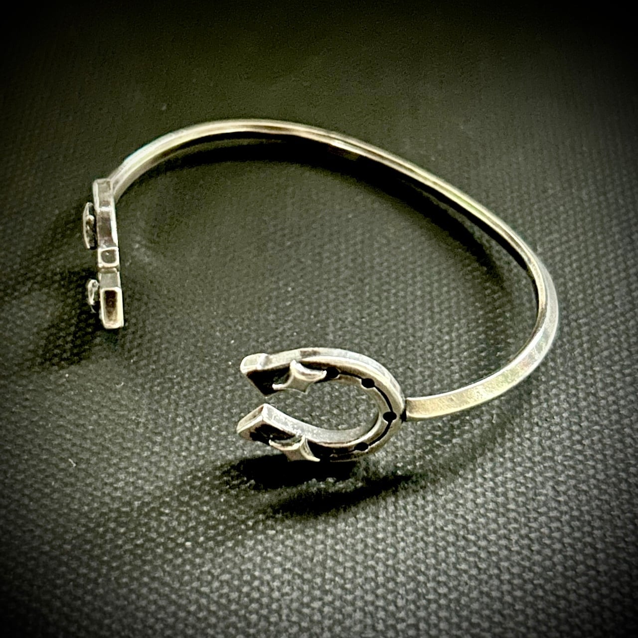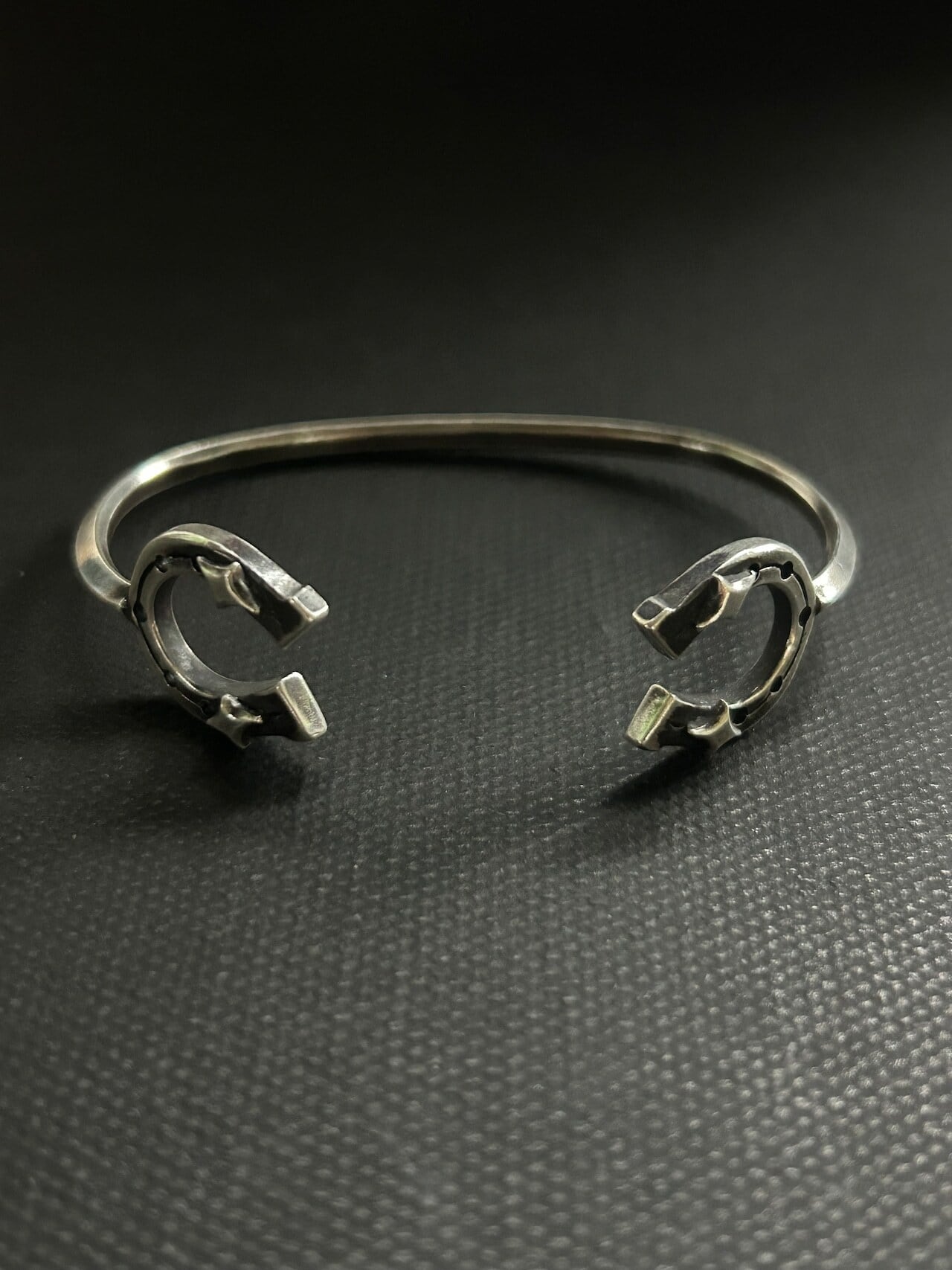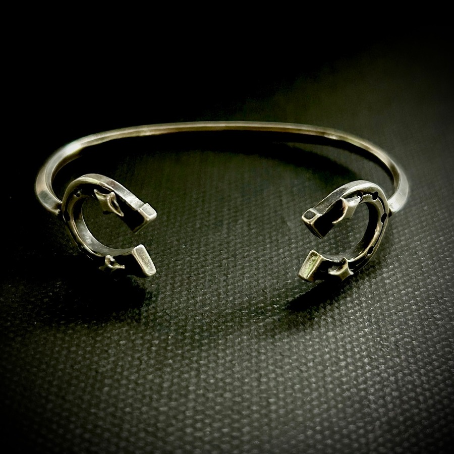 両サイドにhorseshoeを配置したバングルです。細身ながらも存在感のあるデザイン。腕元のアクセントに、重ね付けもいい感じです。こちらのサイズは小さめとなっております。女性、手首細めの男性向けです。