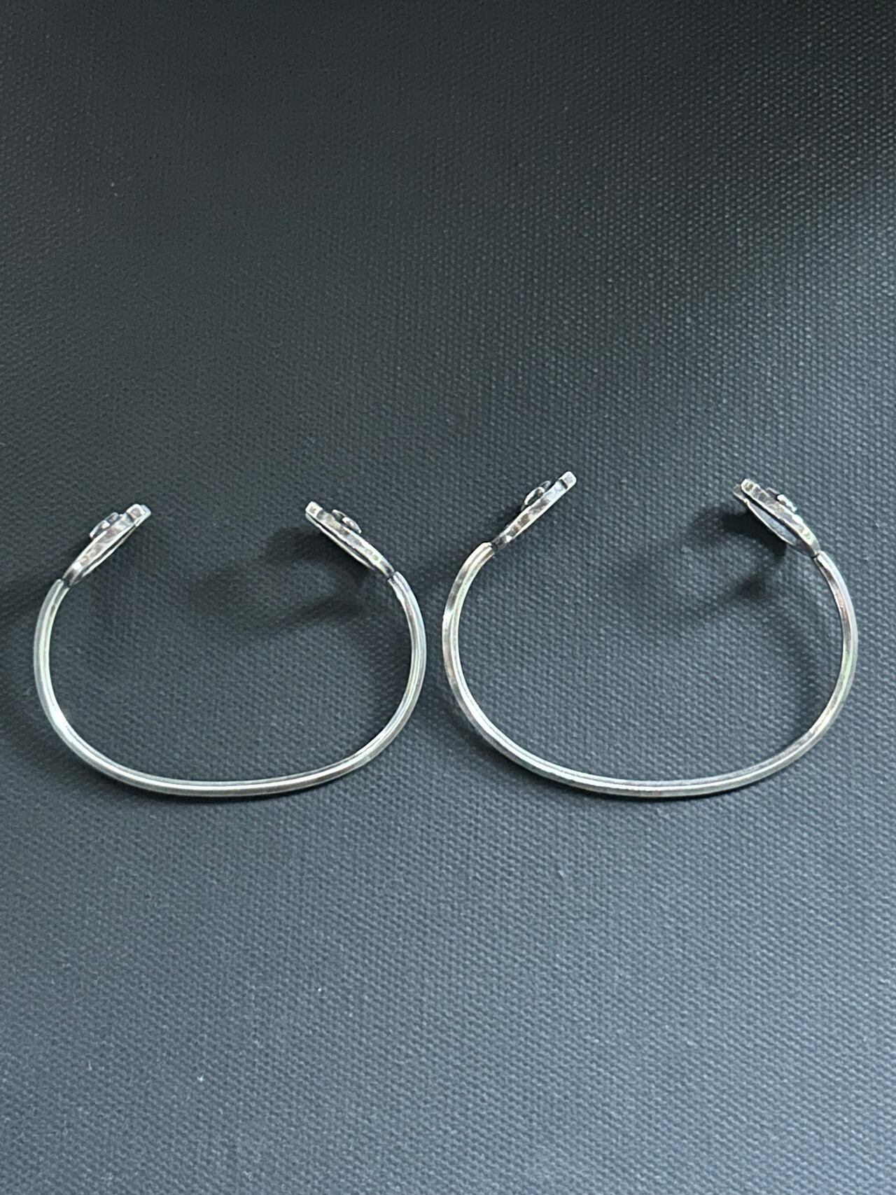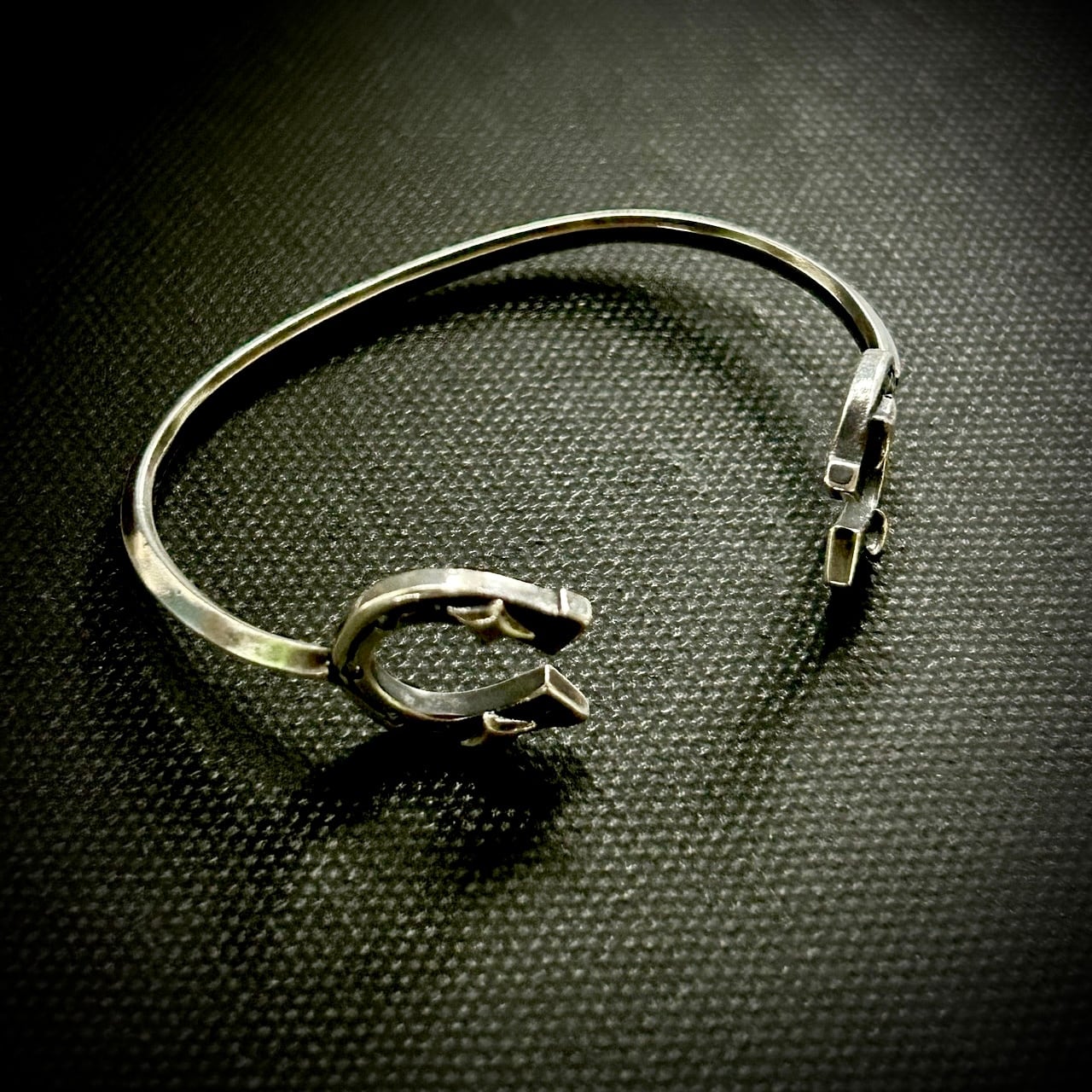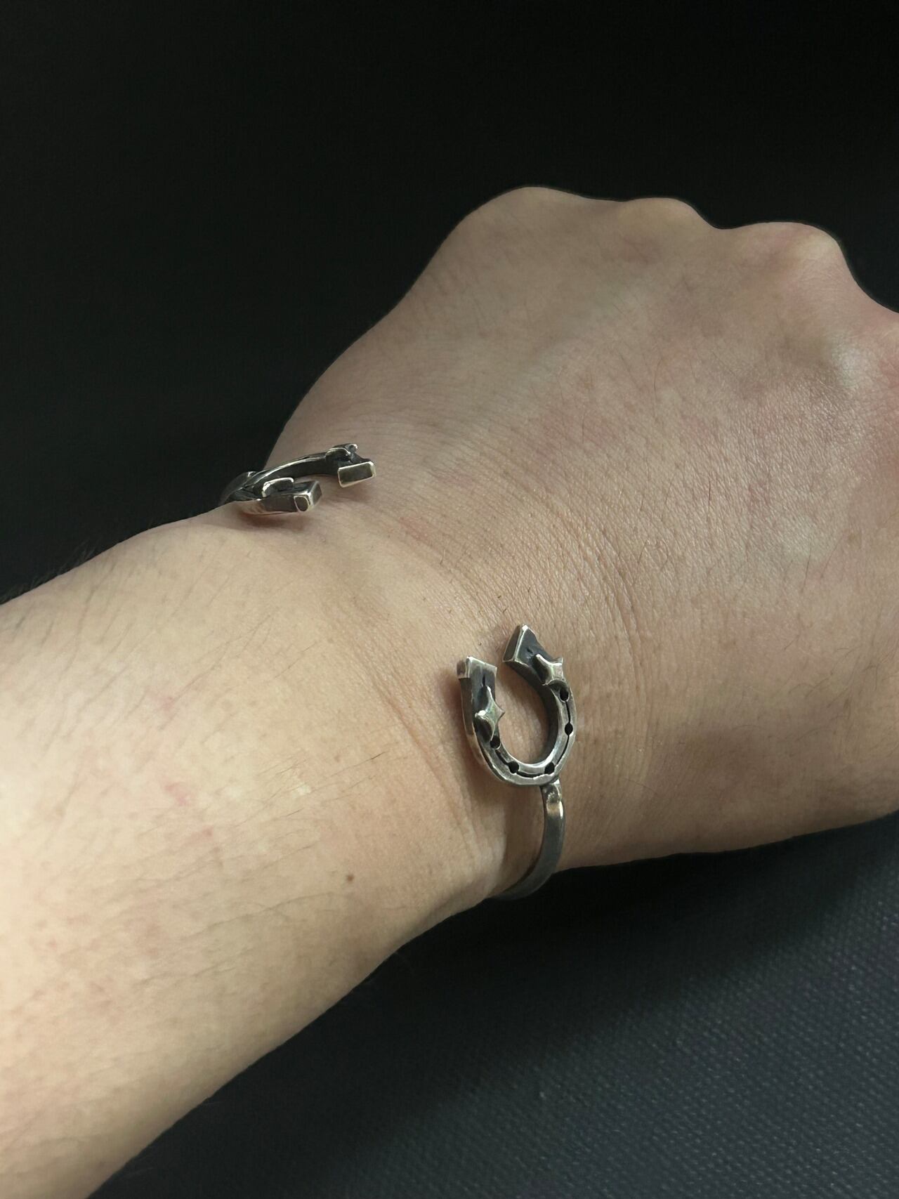 両サイドにhorseshoeを配置したバングルです。細身ながらも存在感のあるデザイン。腕元のアクセントに、重ね付けもいい感じです。こちらのサイズは小さめとなっております。女性、手首細めの男性向けです。