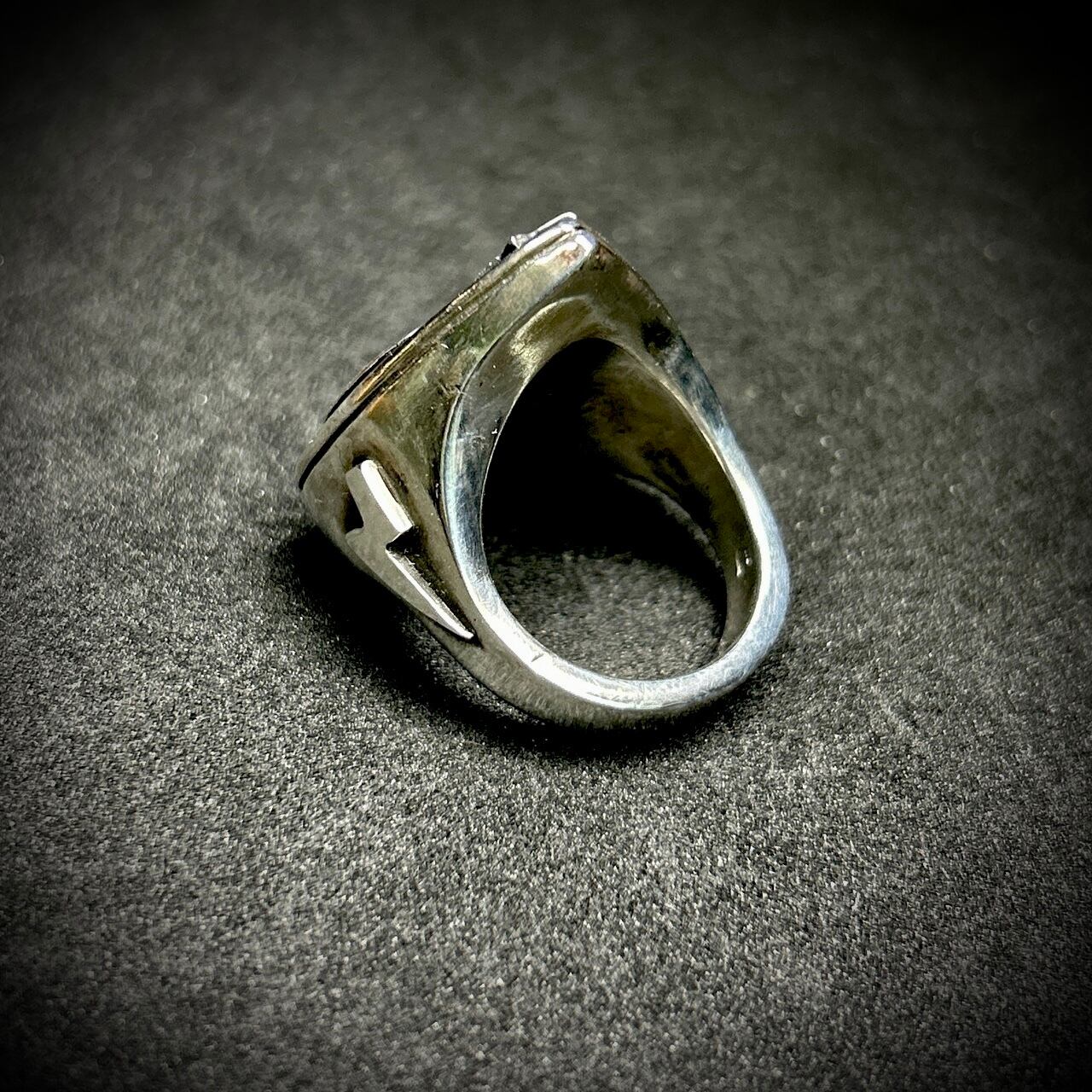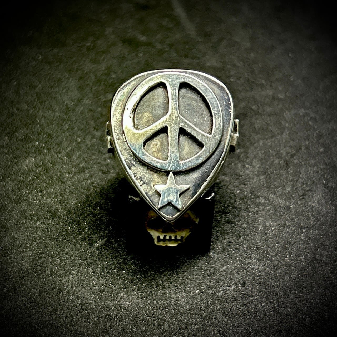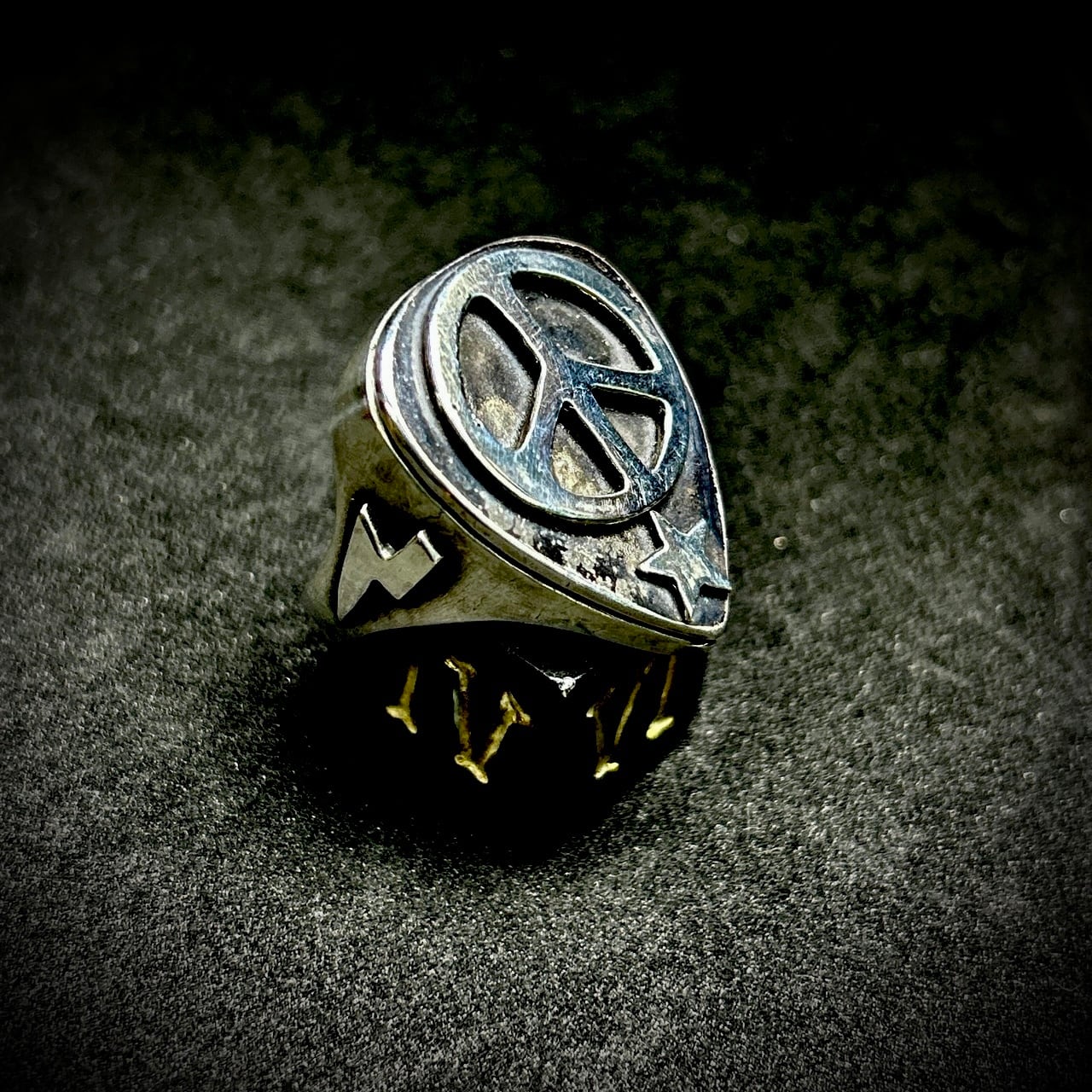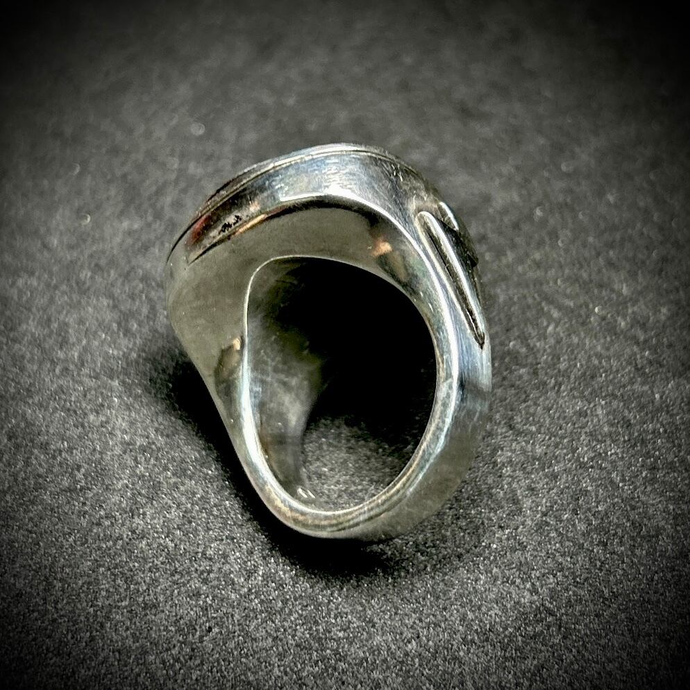 ピック型の印台リングにピースマークをセット。内側を肉抜きしていないので、かなりボリュームのあるデザインが特徴です。指につけた時の存在感抜群です。
