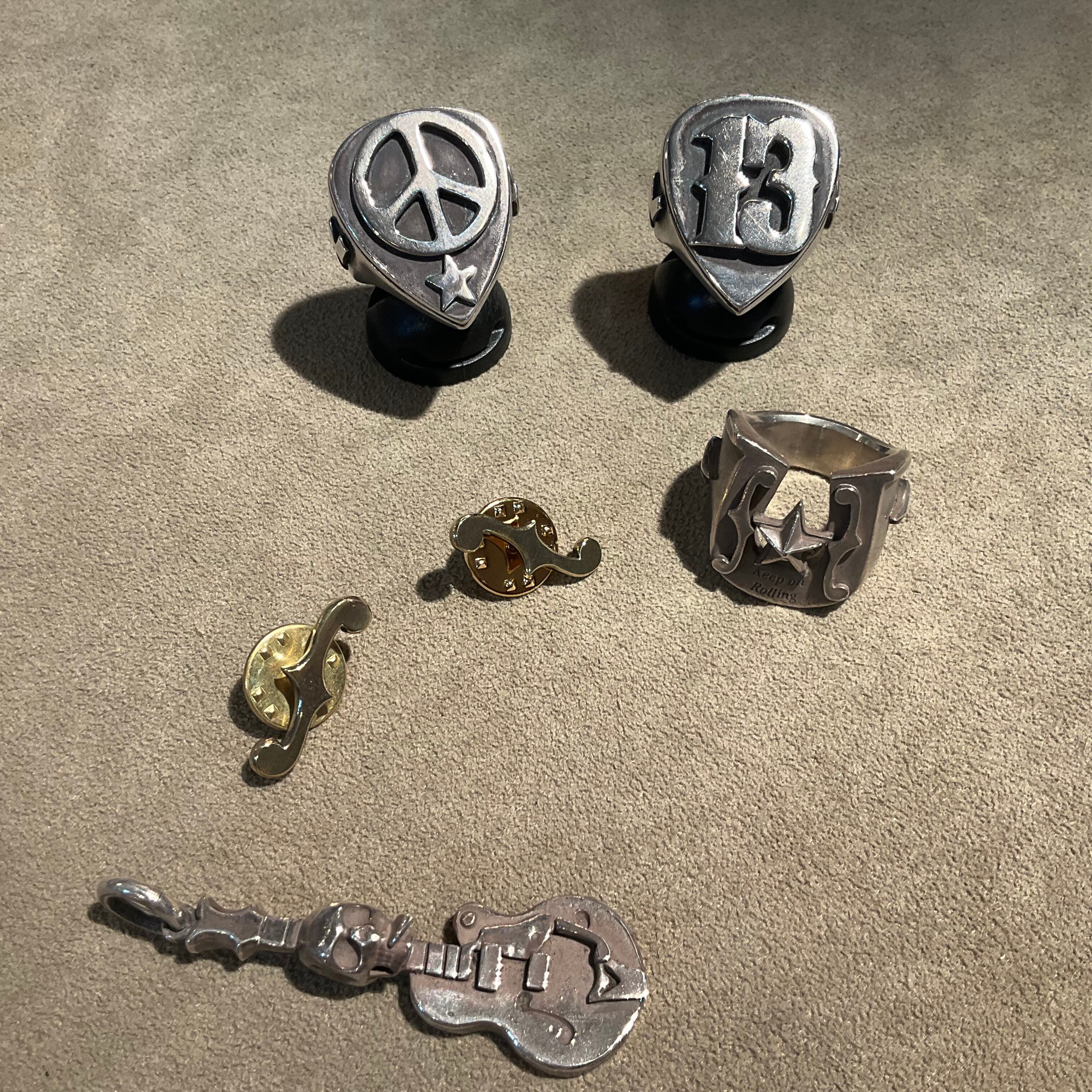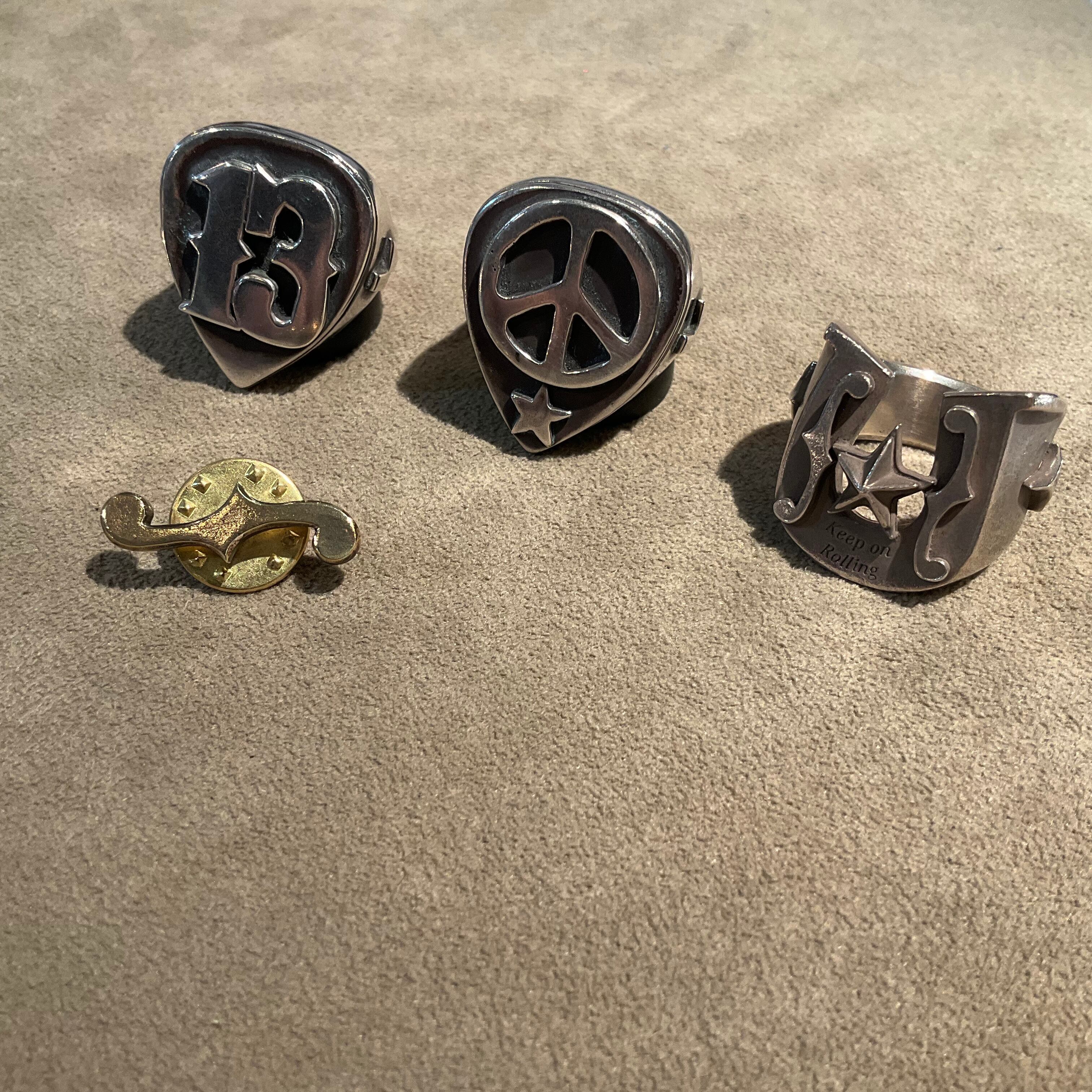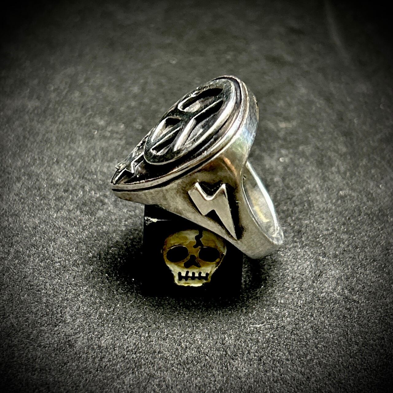 ピック型の印台リングにピースマークをセット。内側を肉抜きしていないので、かなりボリュームのあるデザインが特徴です。指につけた時の存在感抜群です。