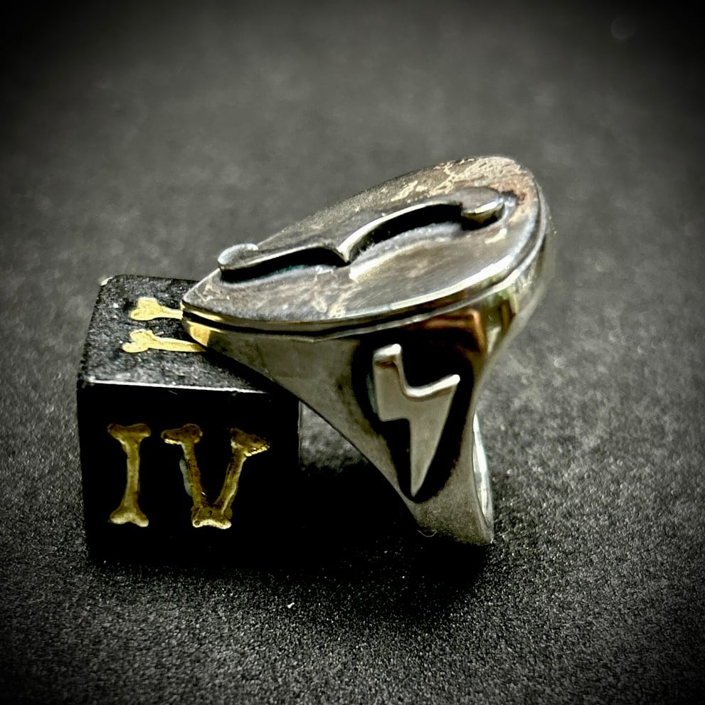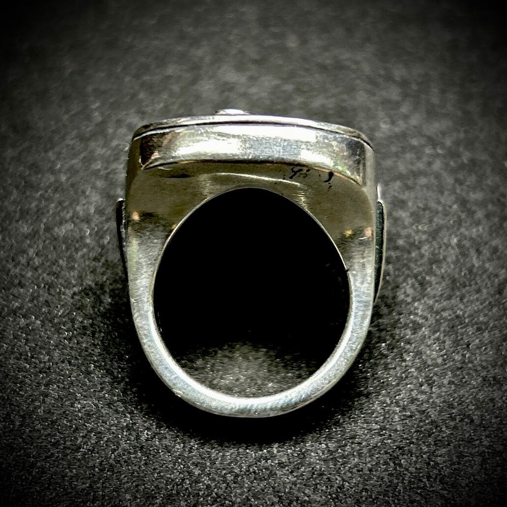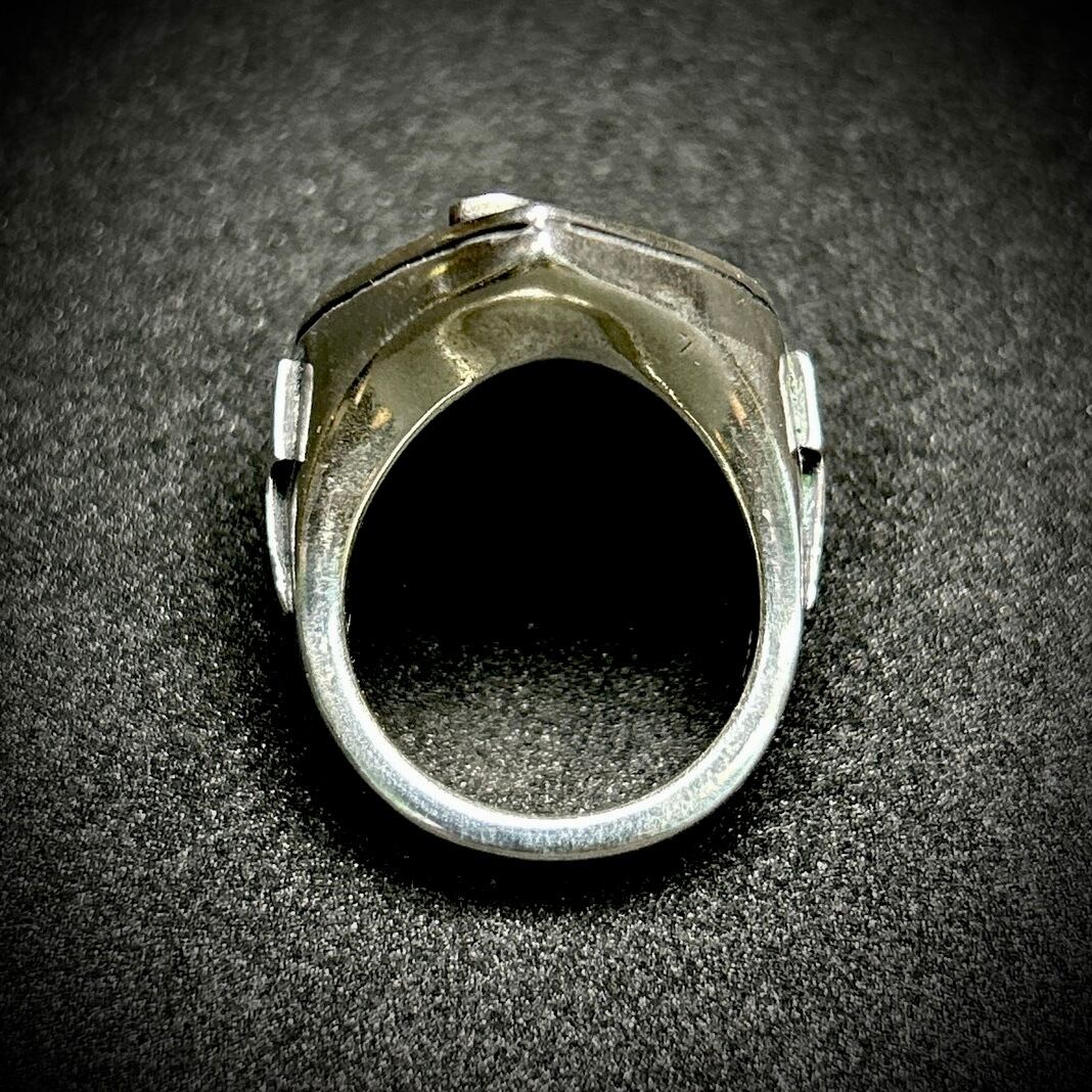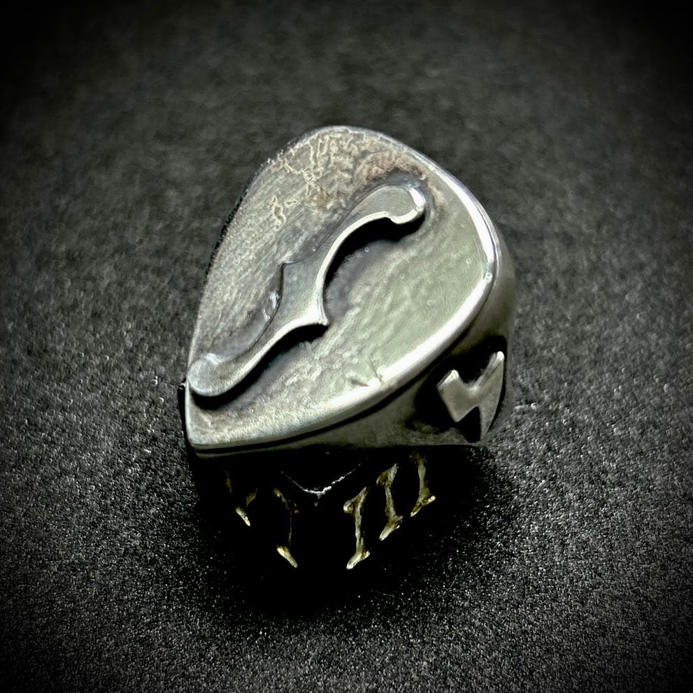 ピック型の印台リングにfholeをセット。内側を肉抜きしていないので、かなりボリュームのあるデザインが特徴です。指につけた時の存在感抜群です。