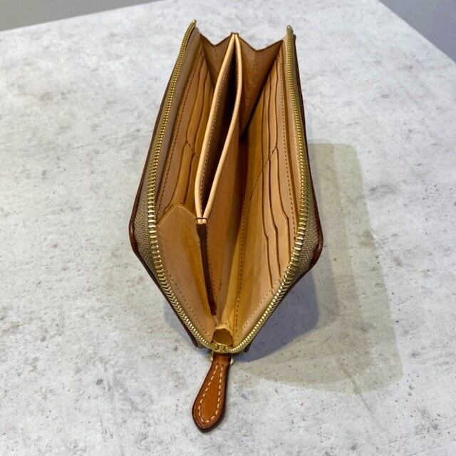 外装の糸は、長年使っていただける様に、手縫いをすることでリペアが出来るような作りになっております。内装のミシン縫いは、手間はかかりますが菱針を使うことで、手縫いのような綺麗な縫い目を実現させています。