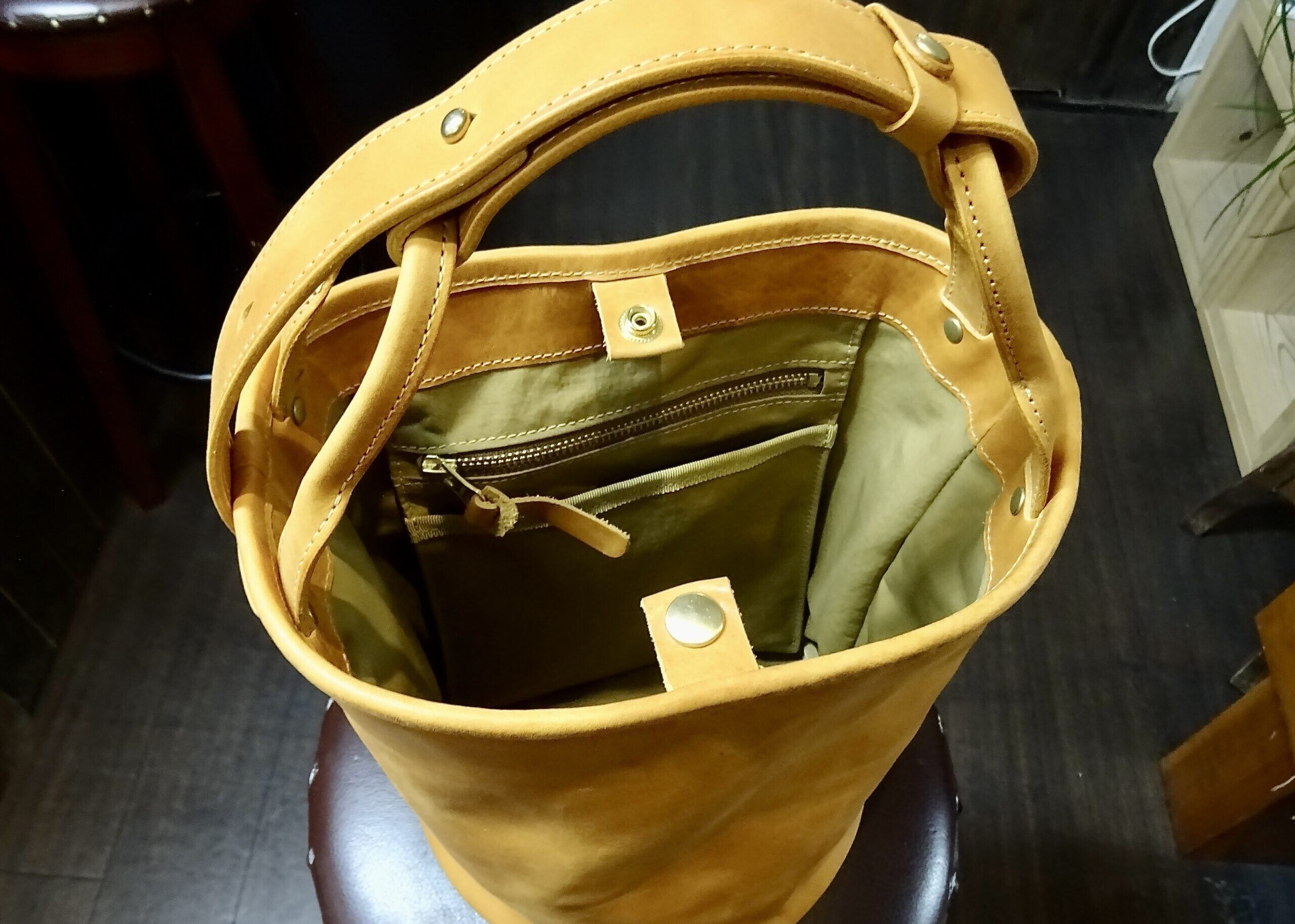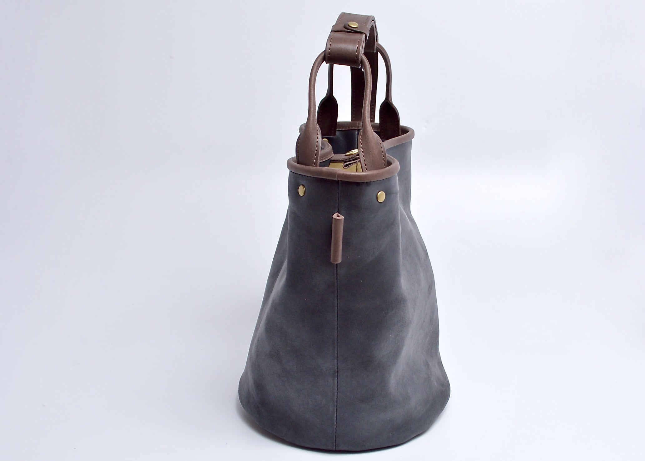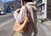 底丸の形は体との干渉が気になる所ですが、体に馴染みやすいように底の外側は柔らかめに仕上げております。それにより肩や腕に掛けても違和感なく持ち歩けるようにしました。