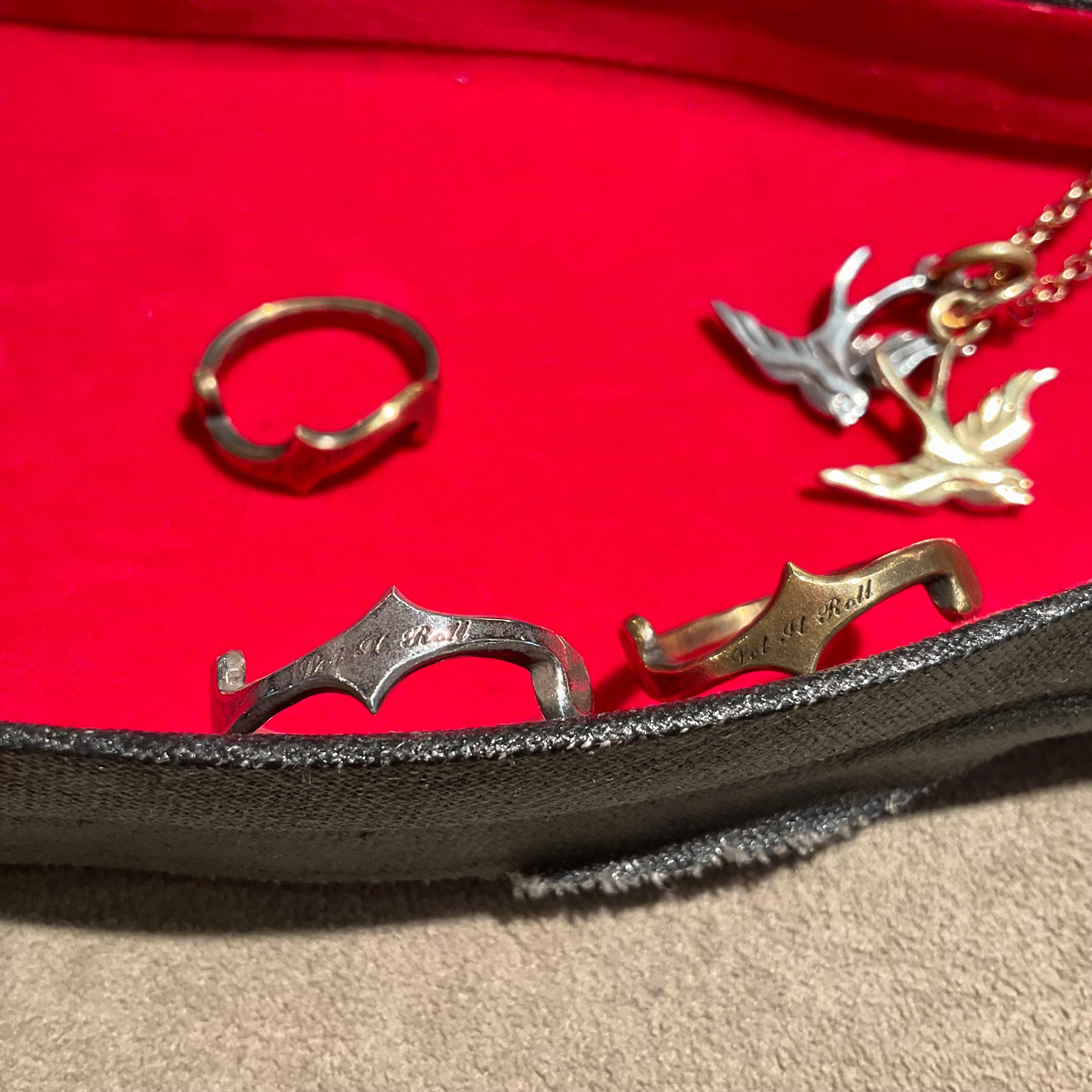 細目でシンプルにビンテージライクな雰囲気に仕上げました。fholeの中央にはlet it rollの刻印。重ね付け、単体付け、自身好みの付け方で。